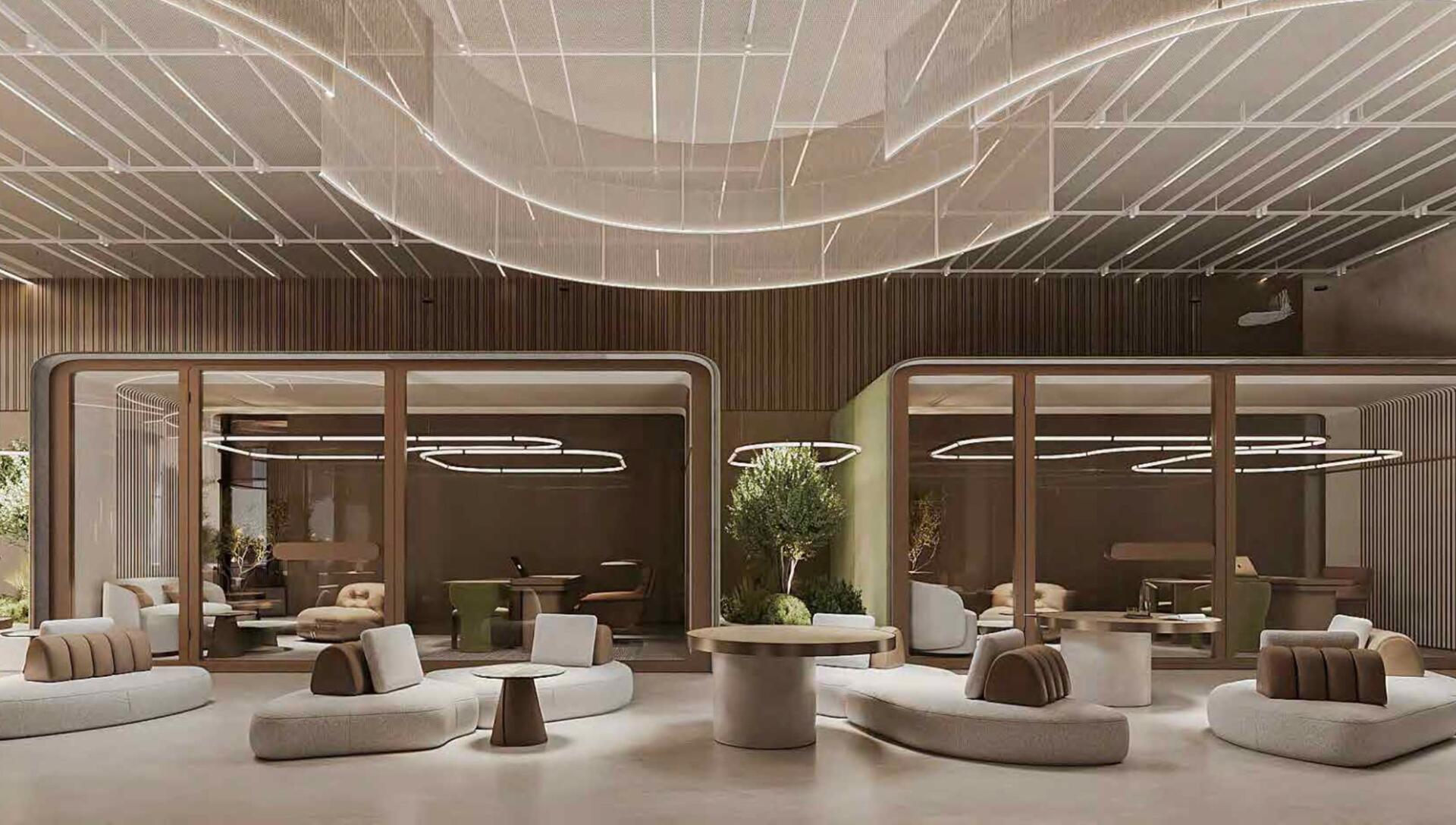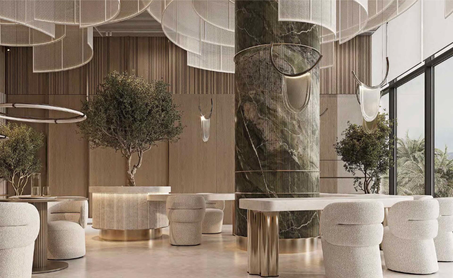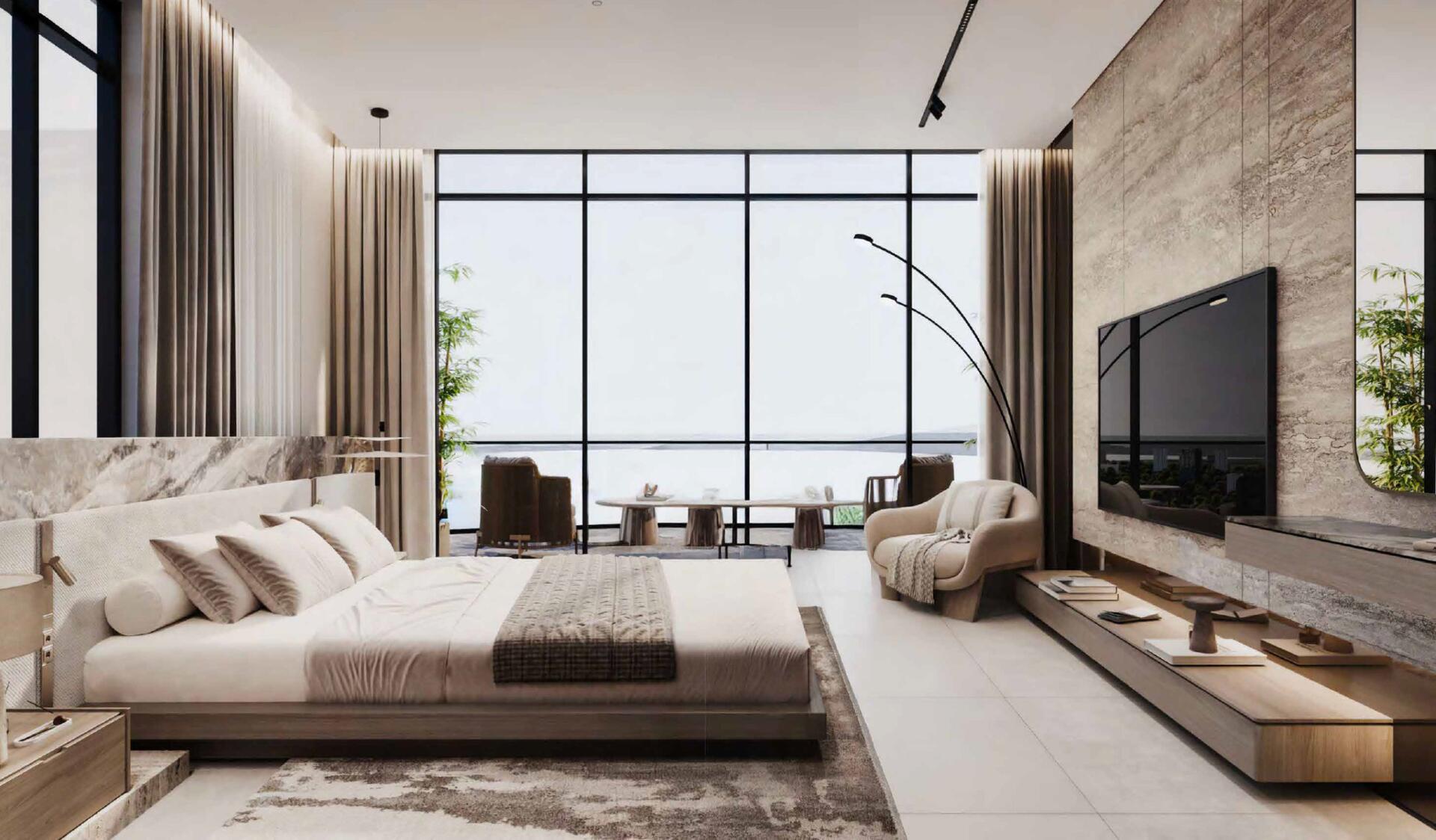 The architecture follows a contemporary organic design, characterized by flowing lines and glass façades that reflect the tranquil lagoon surroundings. Interiors are thoughtfully designed using light tones, natural stone, wood, and glass, creating a balanced and comfortable living environment complemented by spacious balconies with lagoon and sea views.