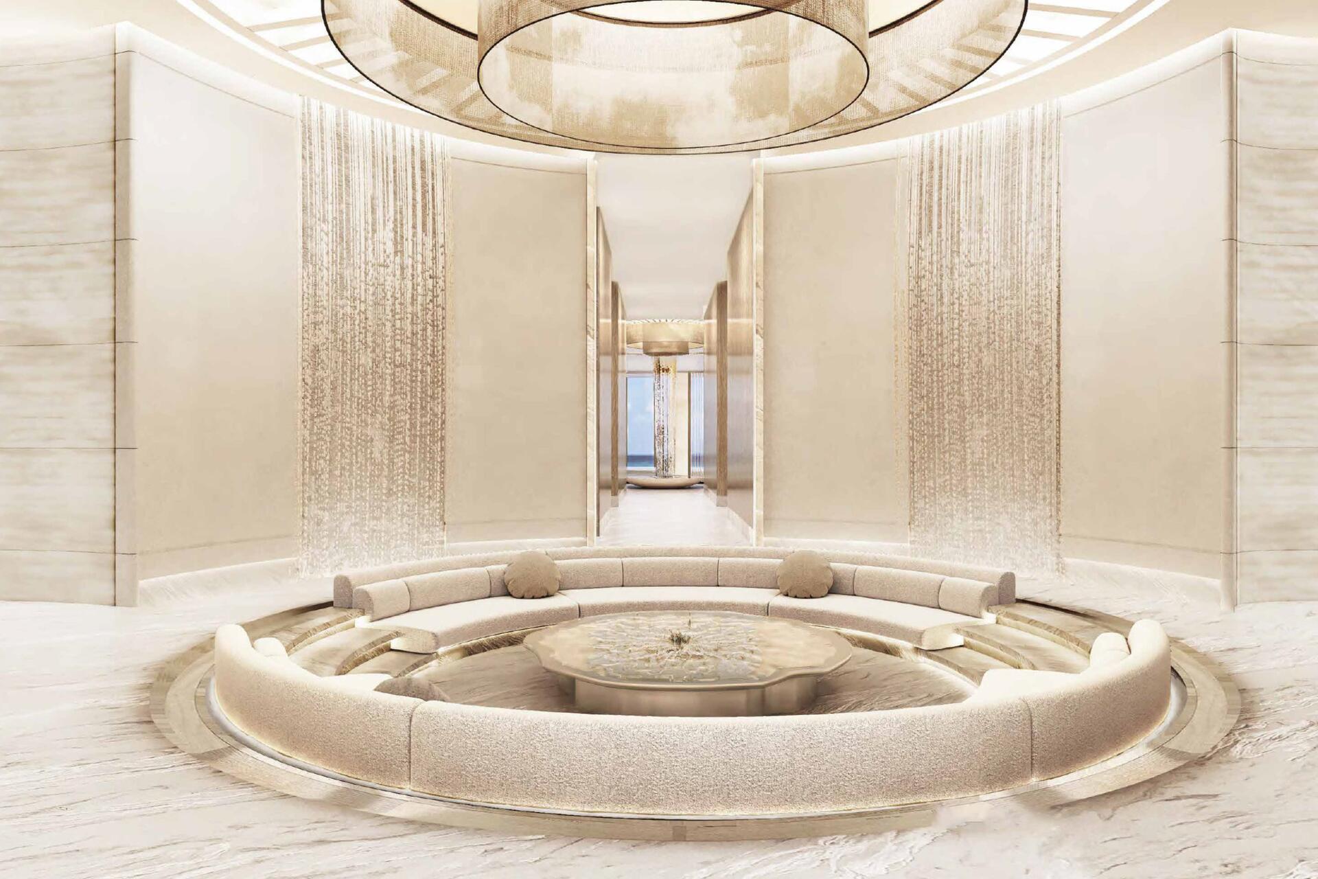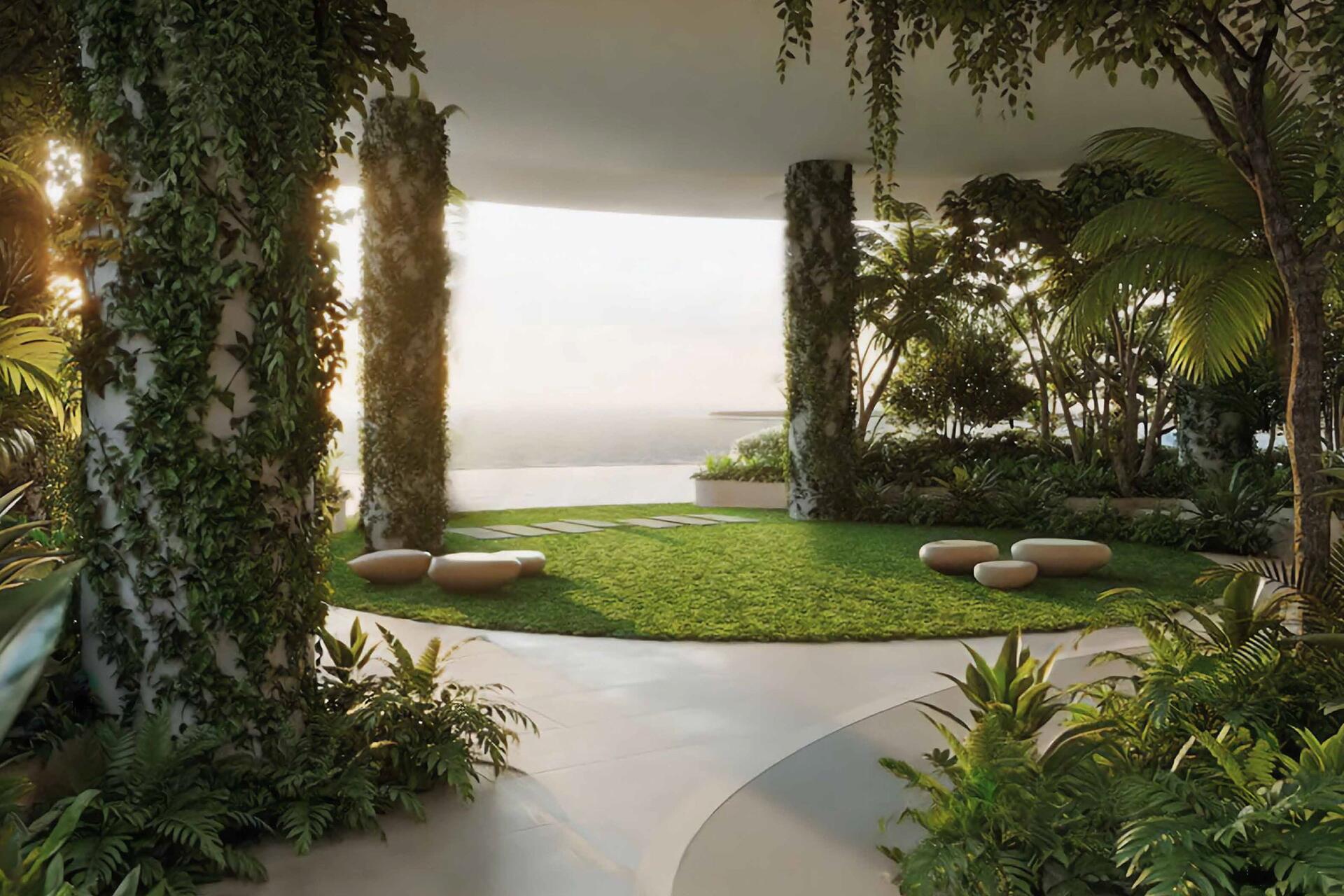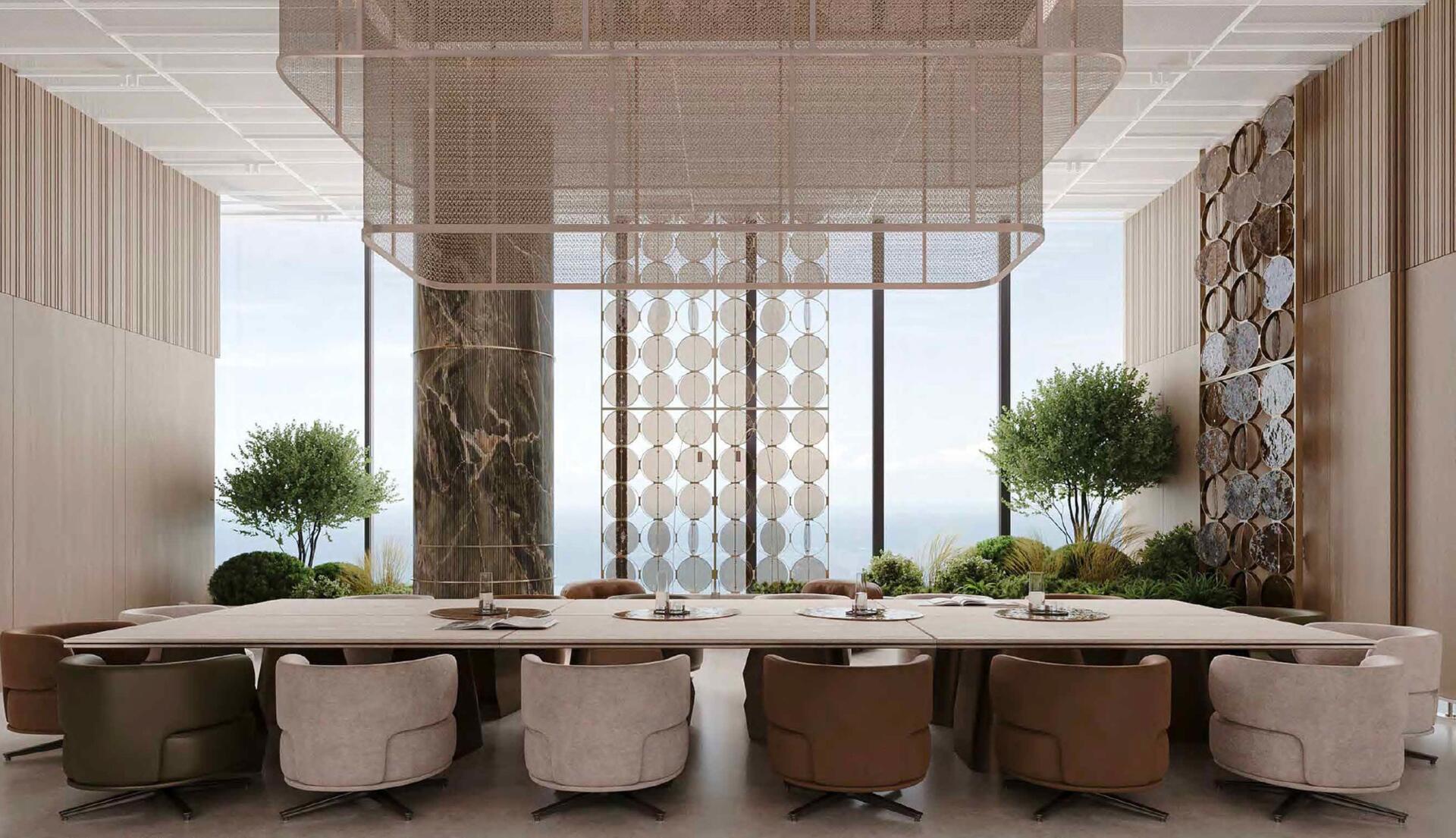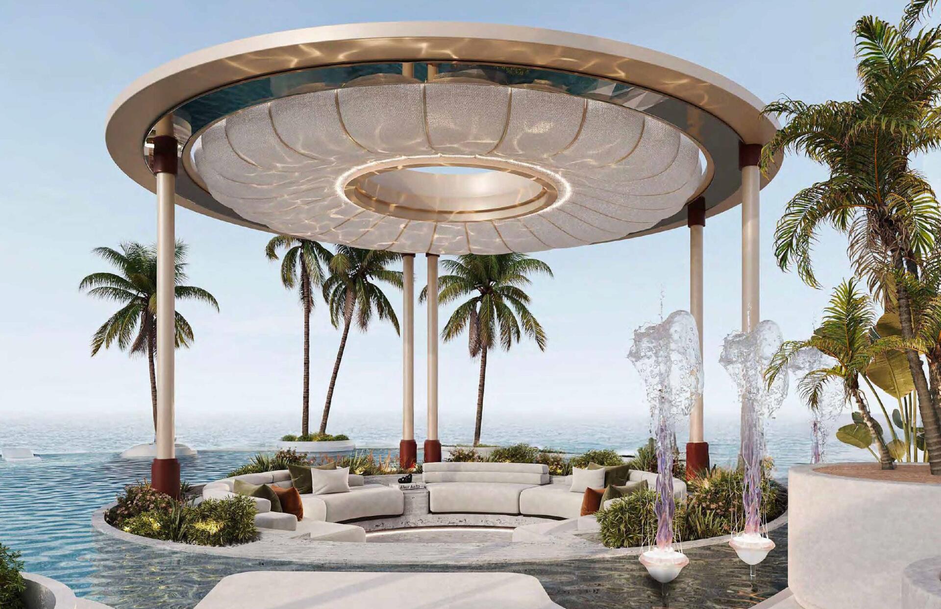 The architecture follows a contemporary organic design, characterized by flowing lines and glass façades that reflect the tranquil lagoon surroundings. Interiors are thoughtfully designed using light tones, natural stone, wood, and glass, creating a balanced and comfortable living environment complemented by spacious balconies with lagoon and sea views.
